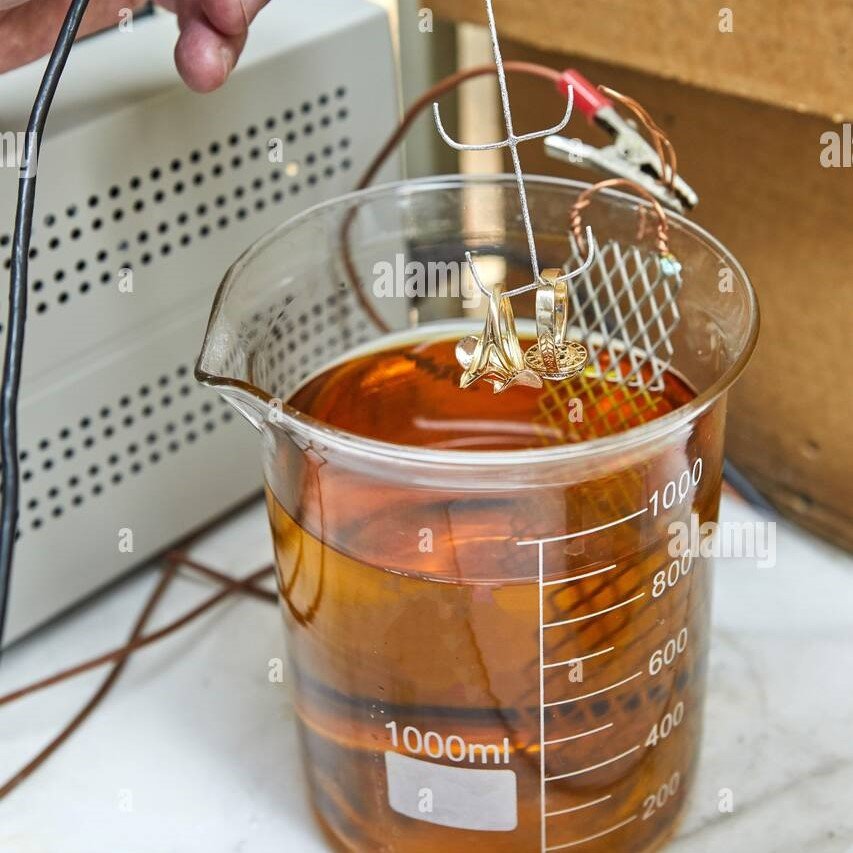 3. Plating: Since white gold is not naturally pure white, it requires plating. The jewelry is plated by attaching electrodes and dipping it in a rhodium solution, giving it a bright, white finish.