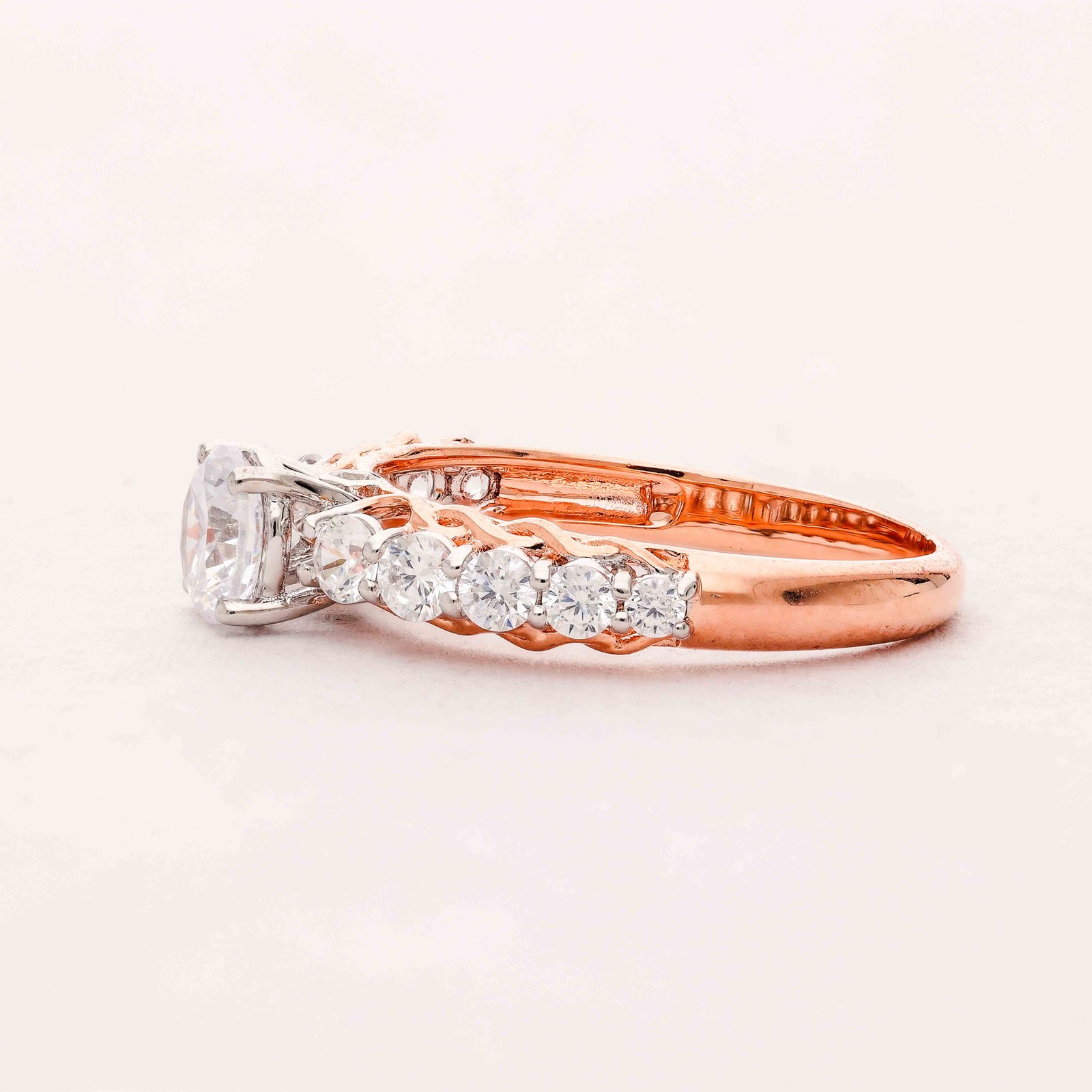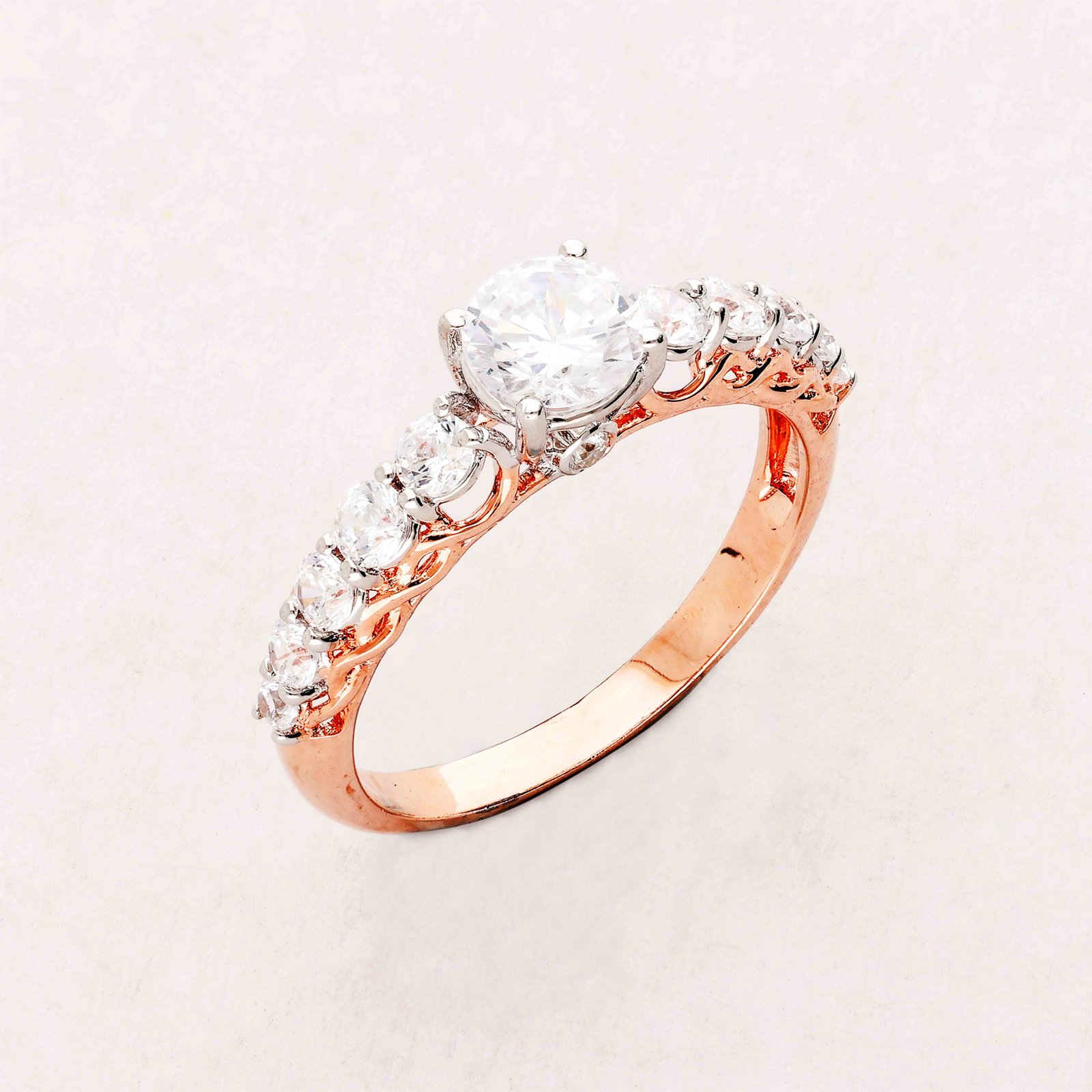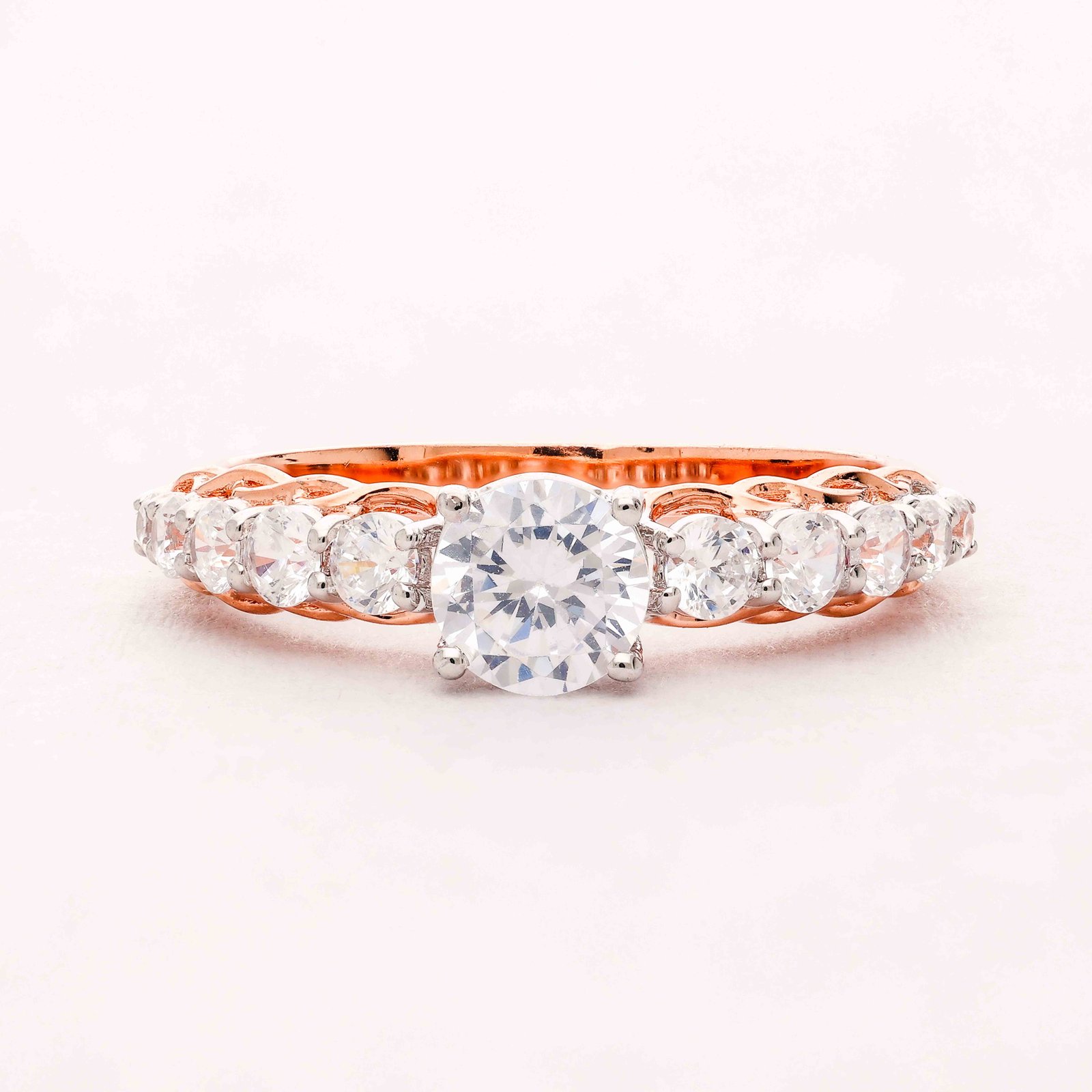 The Elegant Radiance Diamond Ring is a masterpiece of exquisite craftsmanship and design. Featuring a stunning central diamond, meticulously cut to showcase its brilliant sparkle, surrounded by a band adorned with intricate diamond detailing. The rose gold setting adds a touch of warmth, enhancing the radiance of the diamonds. This ring is not just a piece of jewelry but a work of art that symbolizes eternal love and elegance.