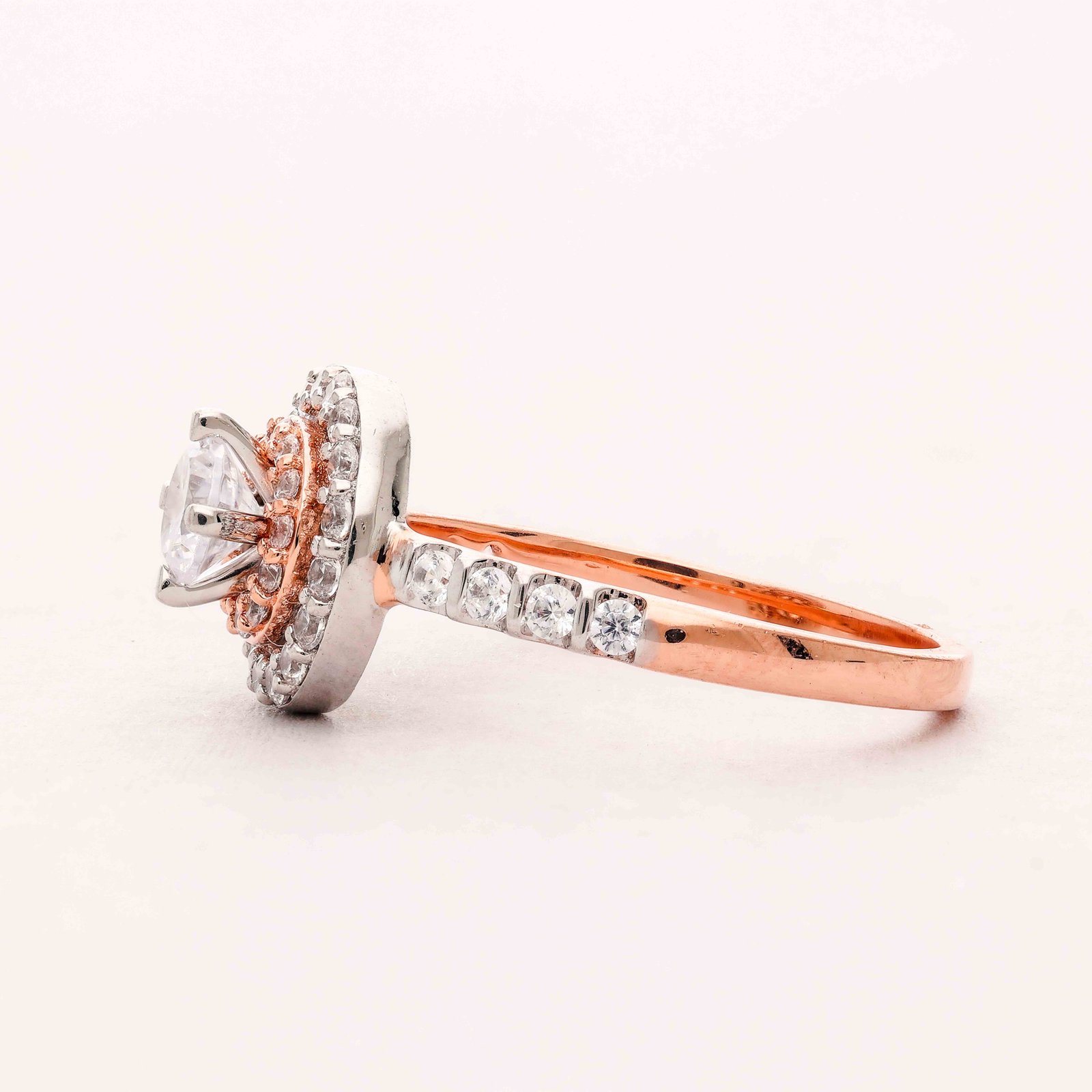 This elegant engagement ring features a central diamond encircled by smaller diamonds, creating a stunning halo effect. The central diamond is a large, round-cut stone that sparkles brilliantly. The halo of smaller diamonds enhances the center stone’s appearance, making it seem even larger. The band of the ring is crafted in two tones: white gold along the top part adorned with diamonds, and rose gold for the rest of the band, giving it a contemporary touch. Additional diamonds embellish the shank of the ring, adding extra brilliance. Overall, it’s a luxurious and captivating piece that symbolizes love and commitment.