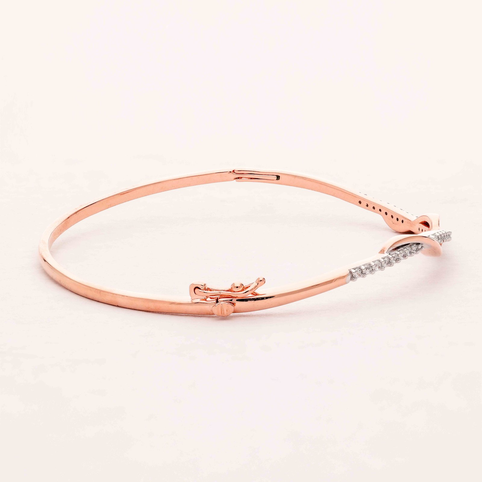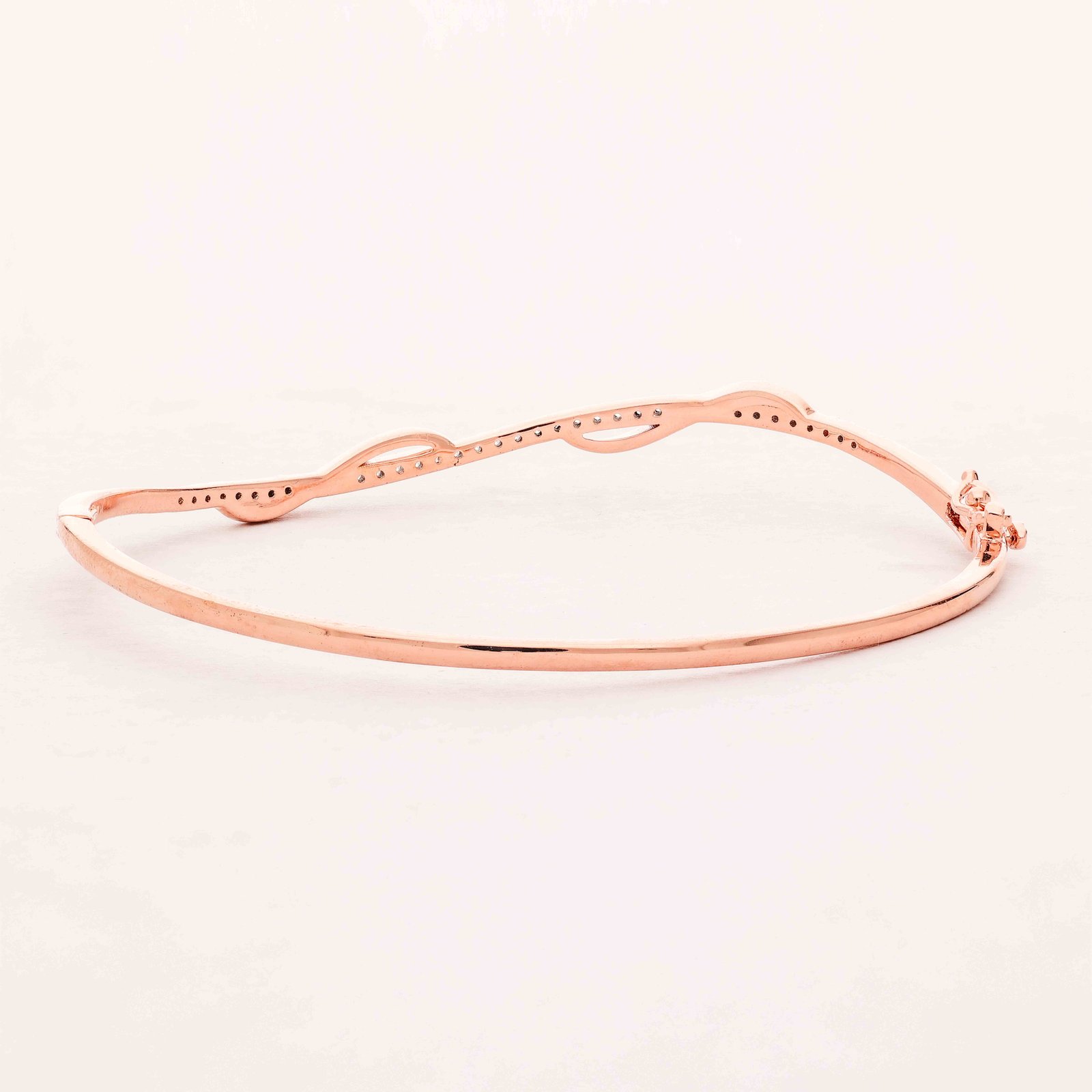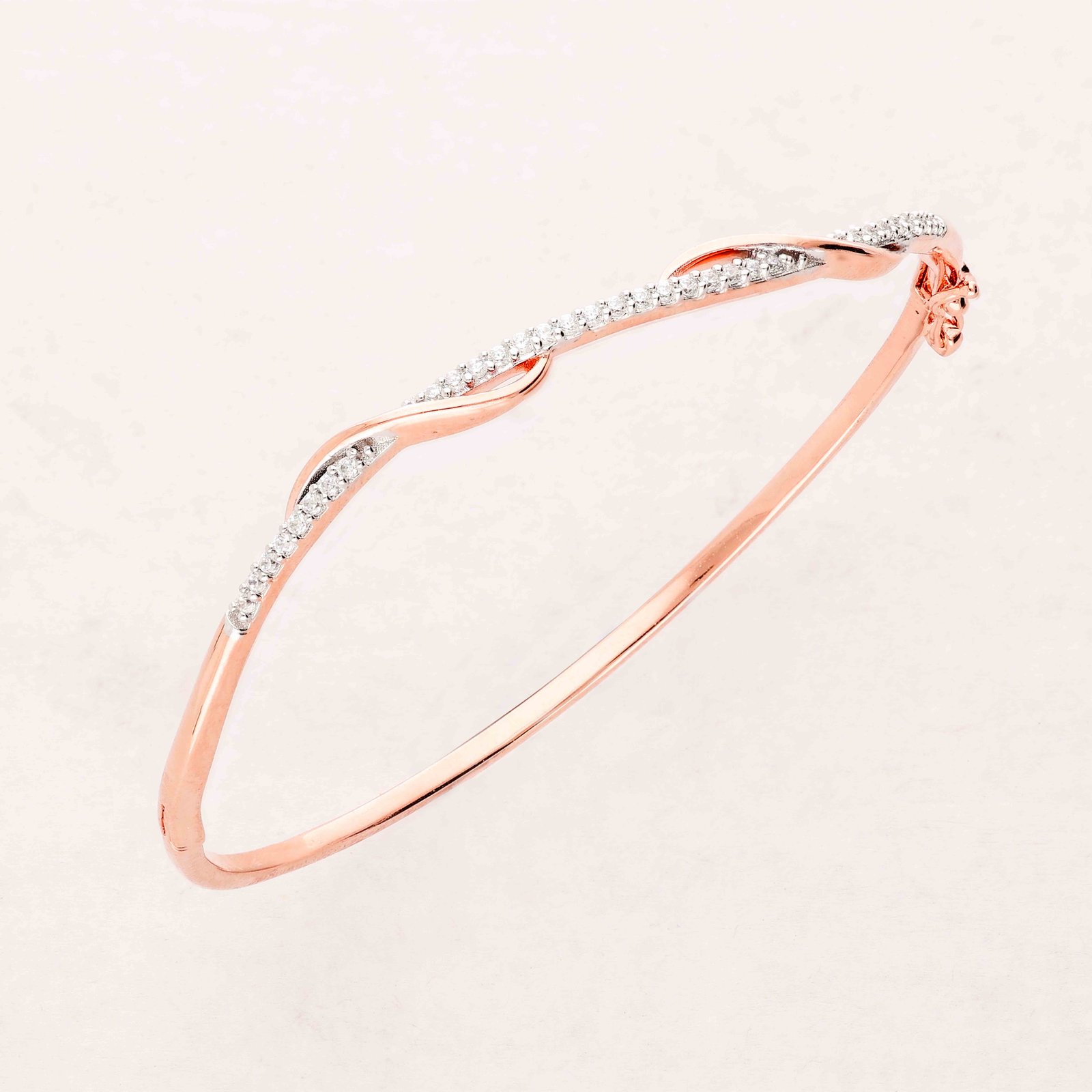 This exquisite bangle, crafted from high-quality rose gold, features a delicate wave design adorned with sparkling diamonds. The elegant curvature of the bangle showcases the diamonds’ brilliance, making it a perfect piece for special occasions and everyday elegance alike.
