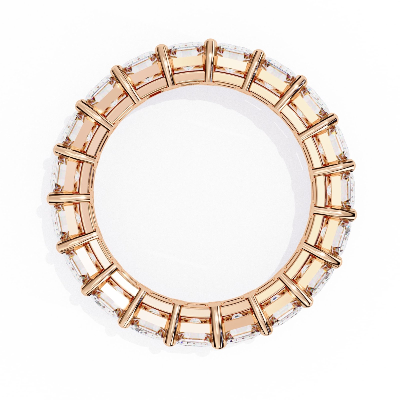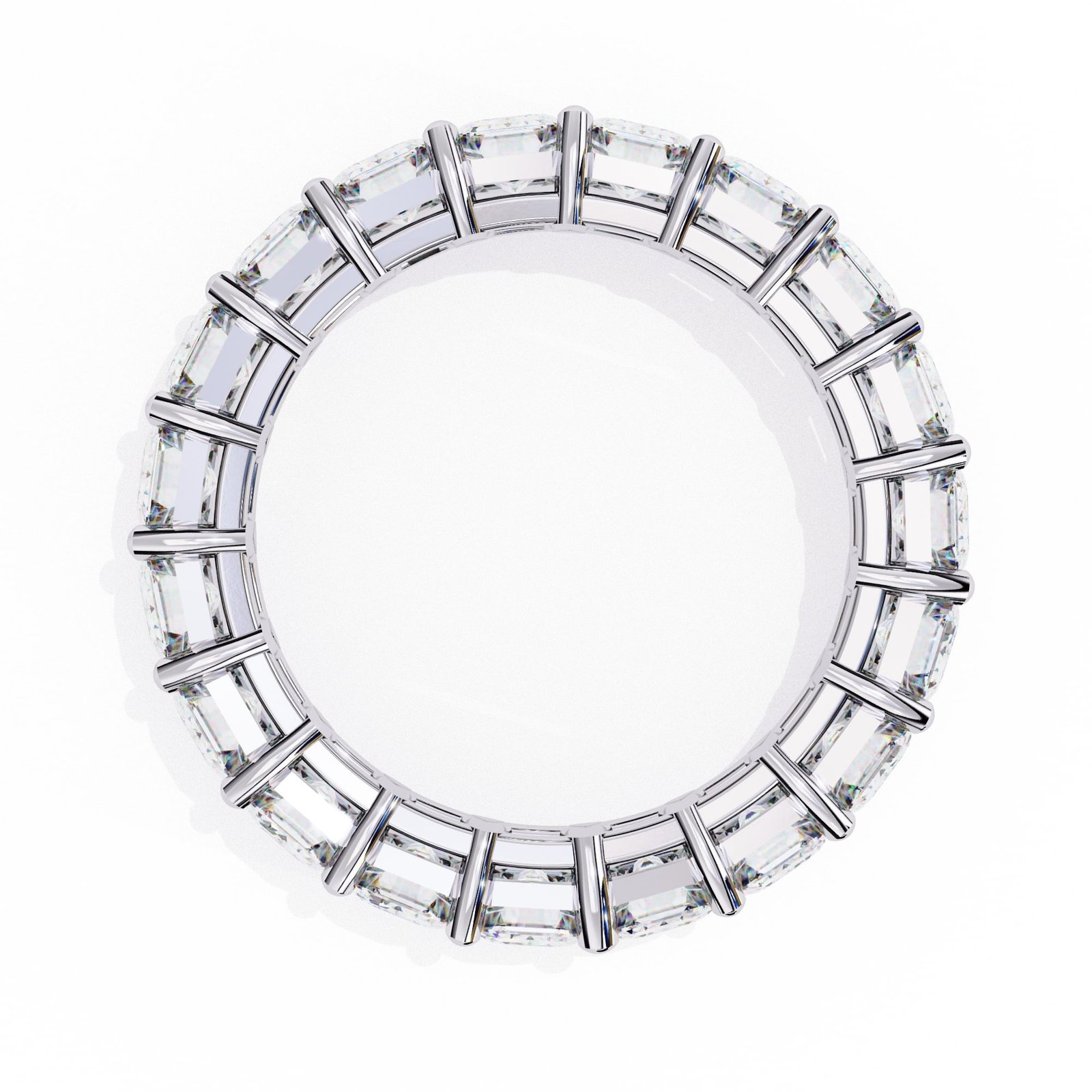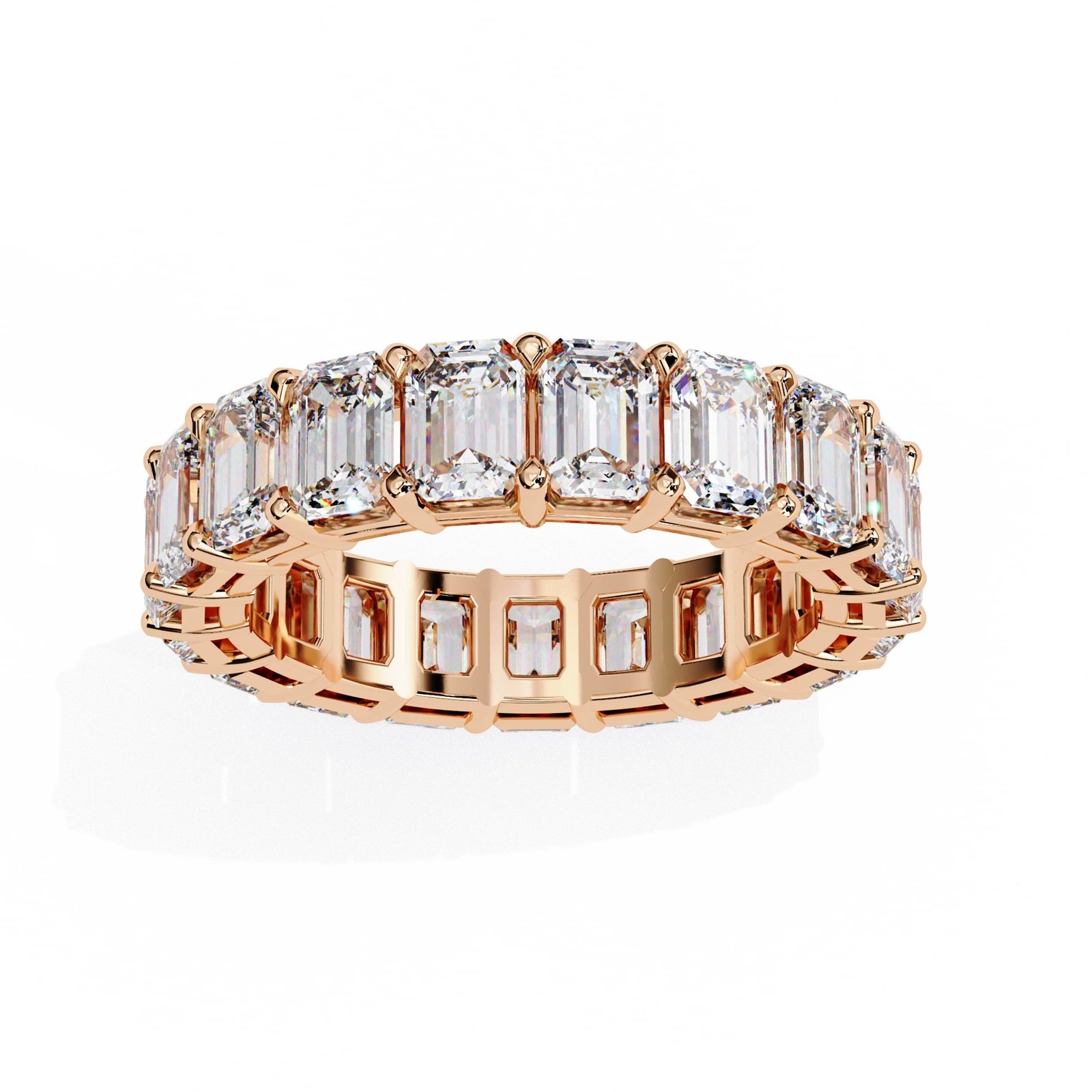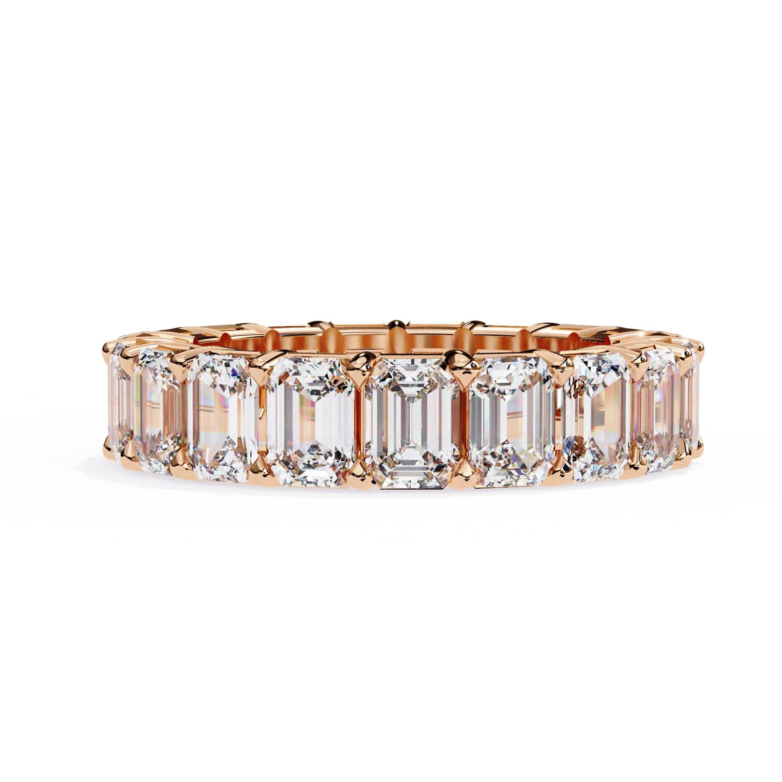 Upgrade your bridal inventory with this precision-crafted Emerald Cut Eternity Band. Featuring calibrated step-cut stones in a secure, open-gallery setting, this design is engineered to optimize light intake and stone brilliance. A high-value, timeless staple ideal for luxury wedding and anniversary collections.