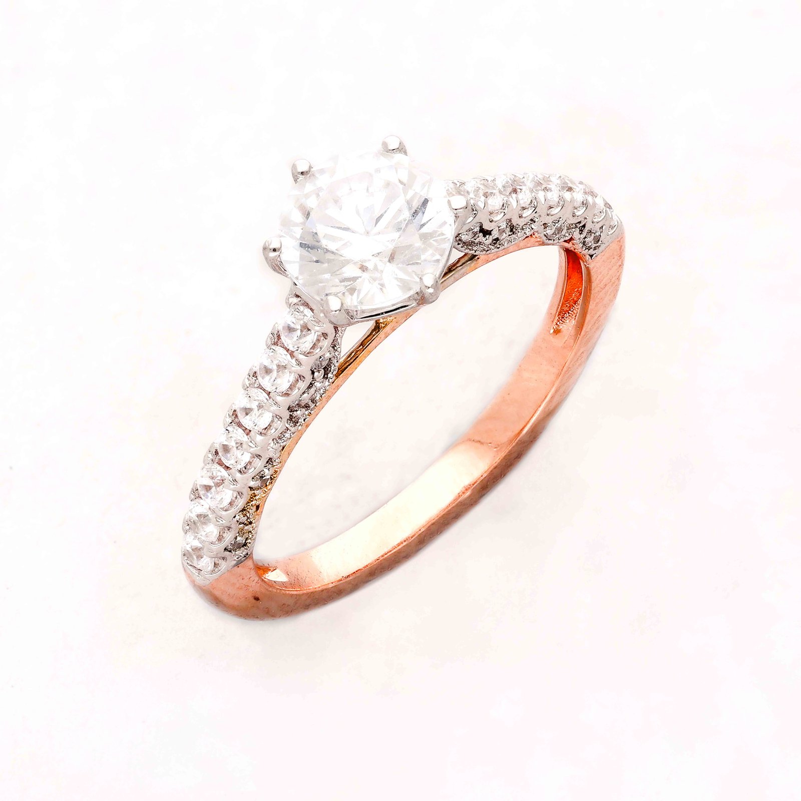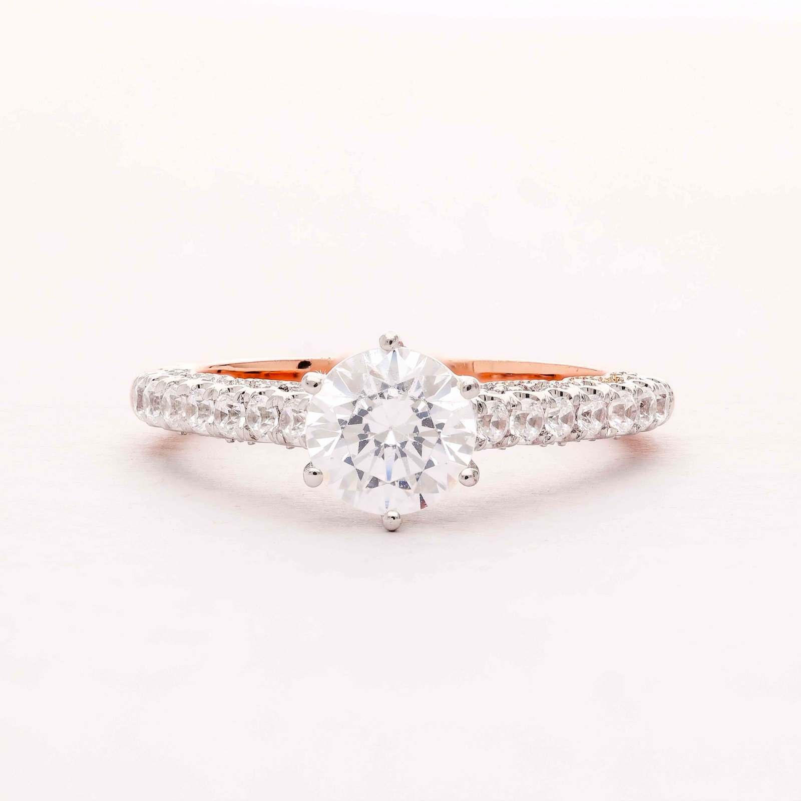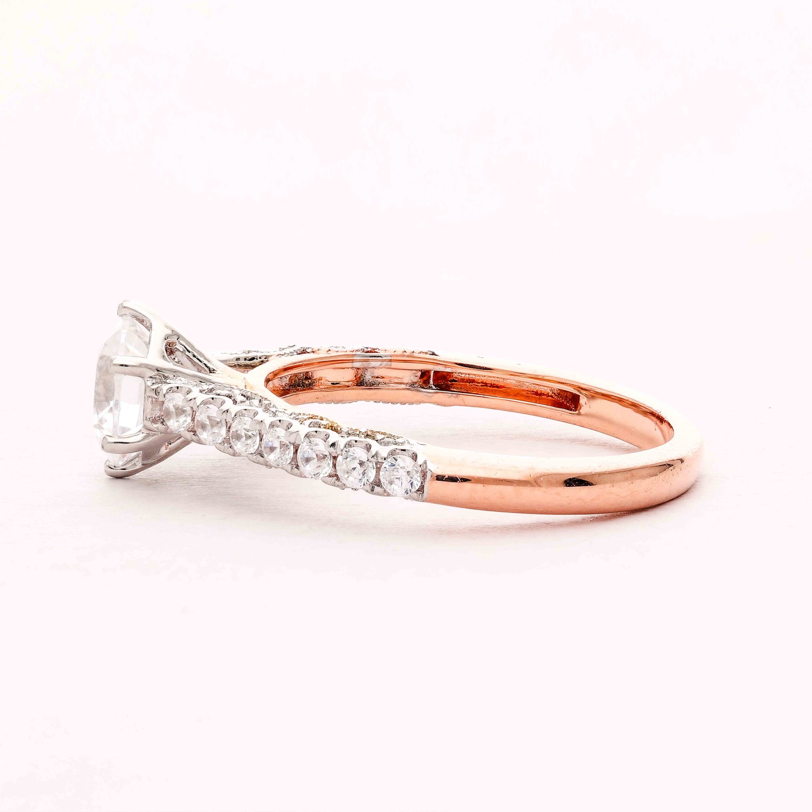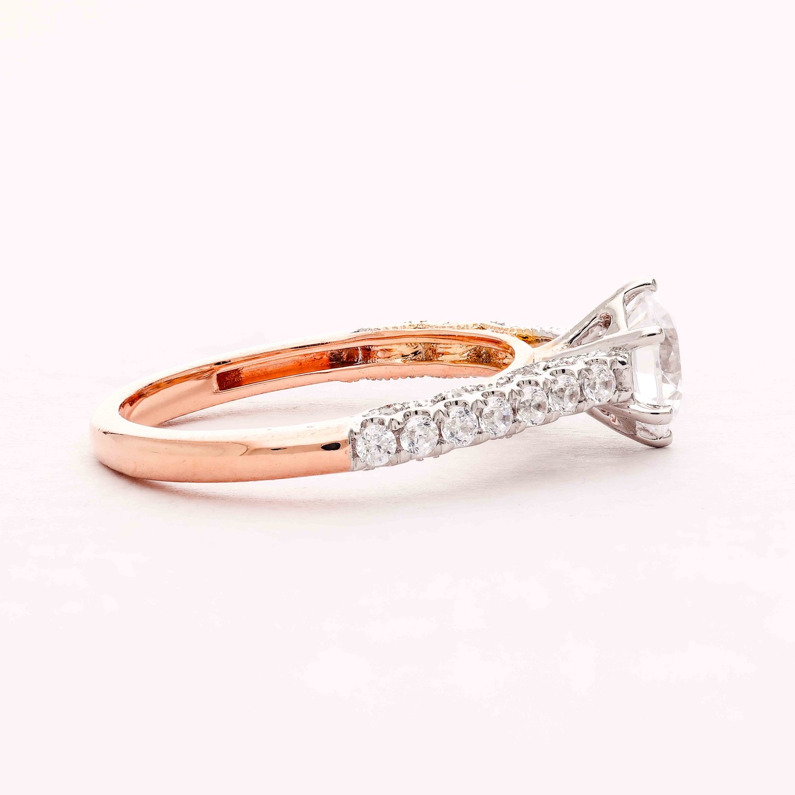 This exquisite engagement ring features a brilliant round cut center diamond, gracefully complemented by a band adorned with sparkling pave-set diamonds. The ring is crafted in a beautiful rose gold setting, offering a modern yet timeless appeal.