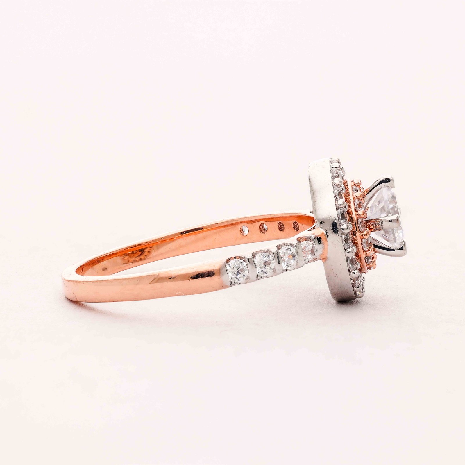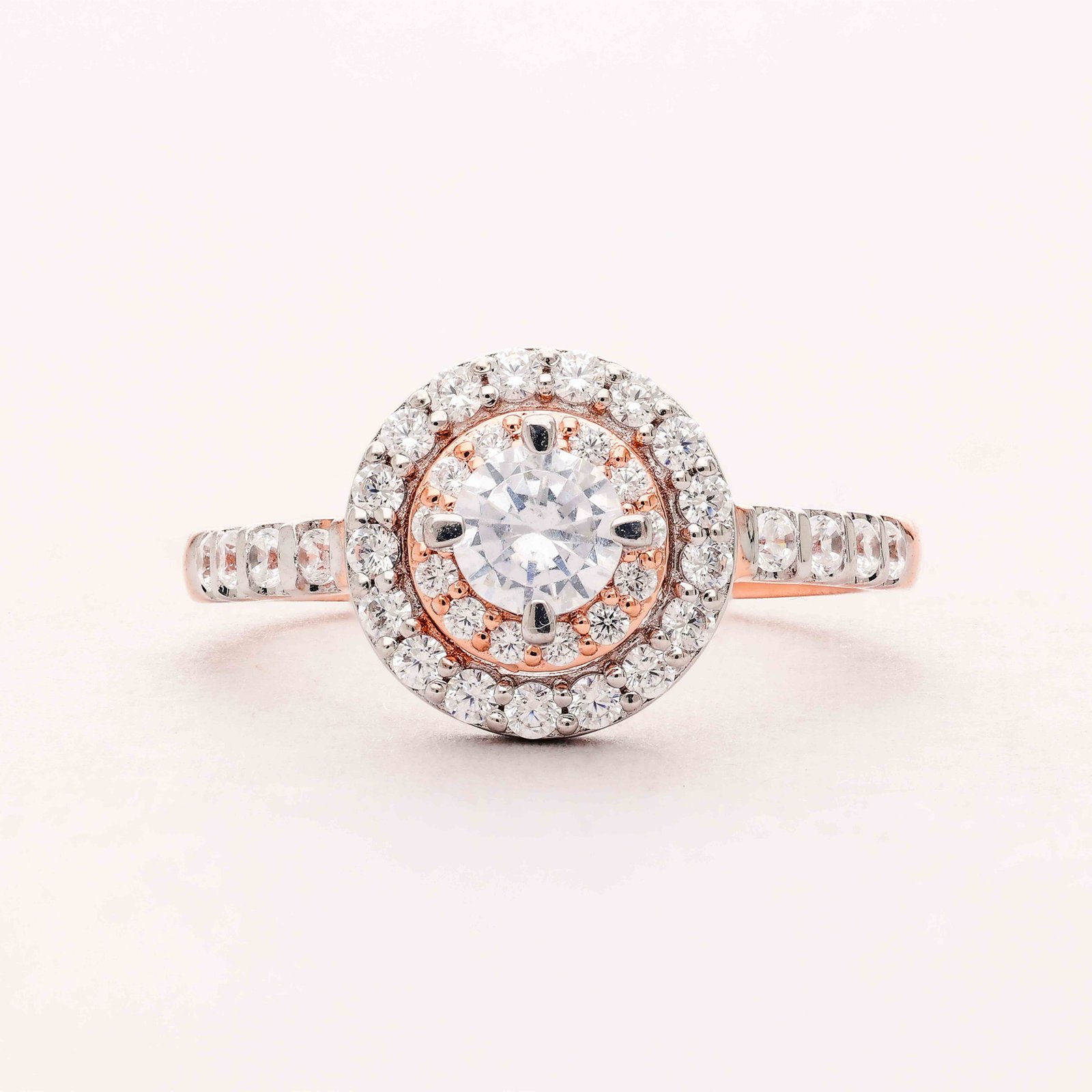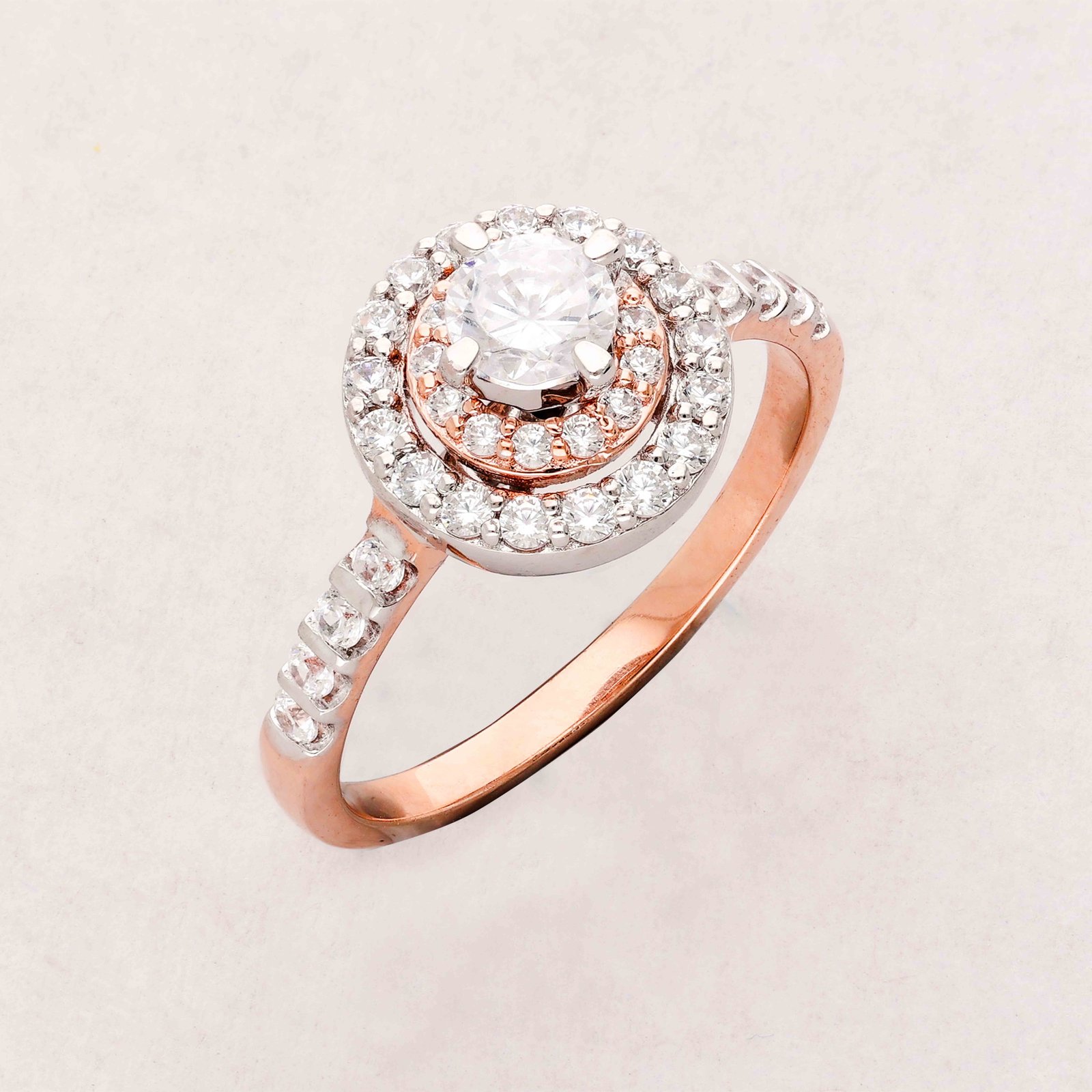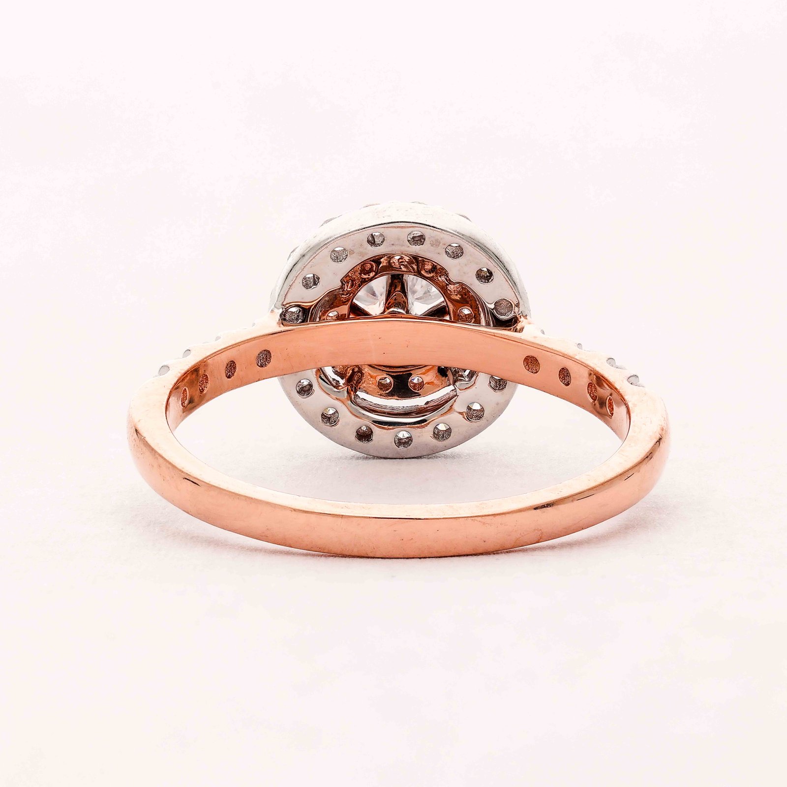 This elegant engagement ring features a central diamond encircled by smaller diamonds, creating a stunning halo effect. The central diamond is a large, round-cut stone that sparkles brilliantly. The halo of smaller diamonds enhances the center stone’s appearance, making it seem even larger. The band of the ring is crafted in two tones: white gold along the top part adorned with diamonds, and rose gold for the rest of the band, giving it a contemporary touch. Additional diamonds embellish the shank of the ring, adding extra brilliance. Overall, it’s a luxurious and captivating piece that symbolizes love and commitment.