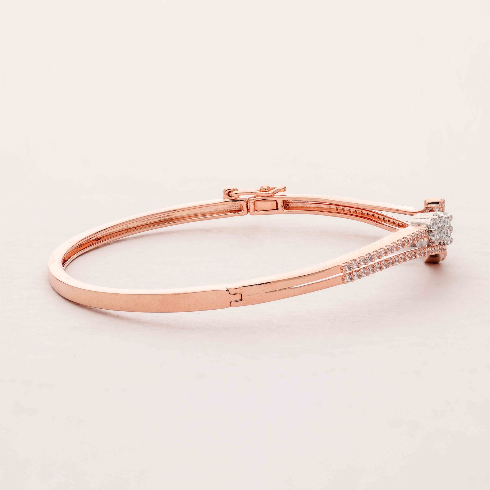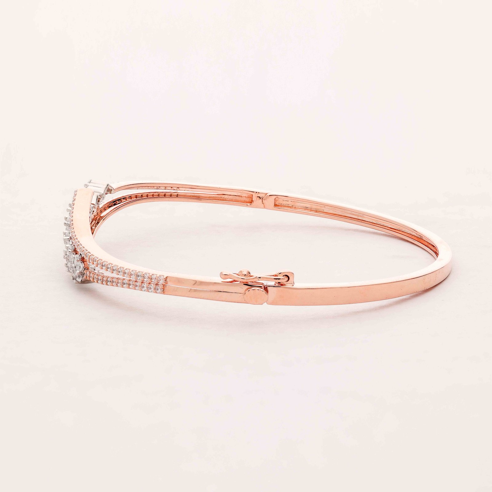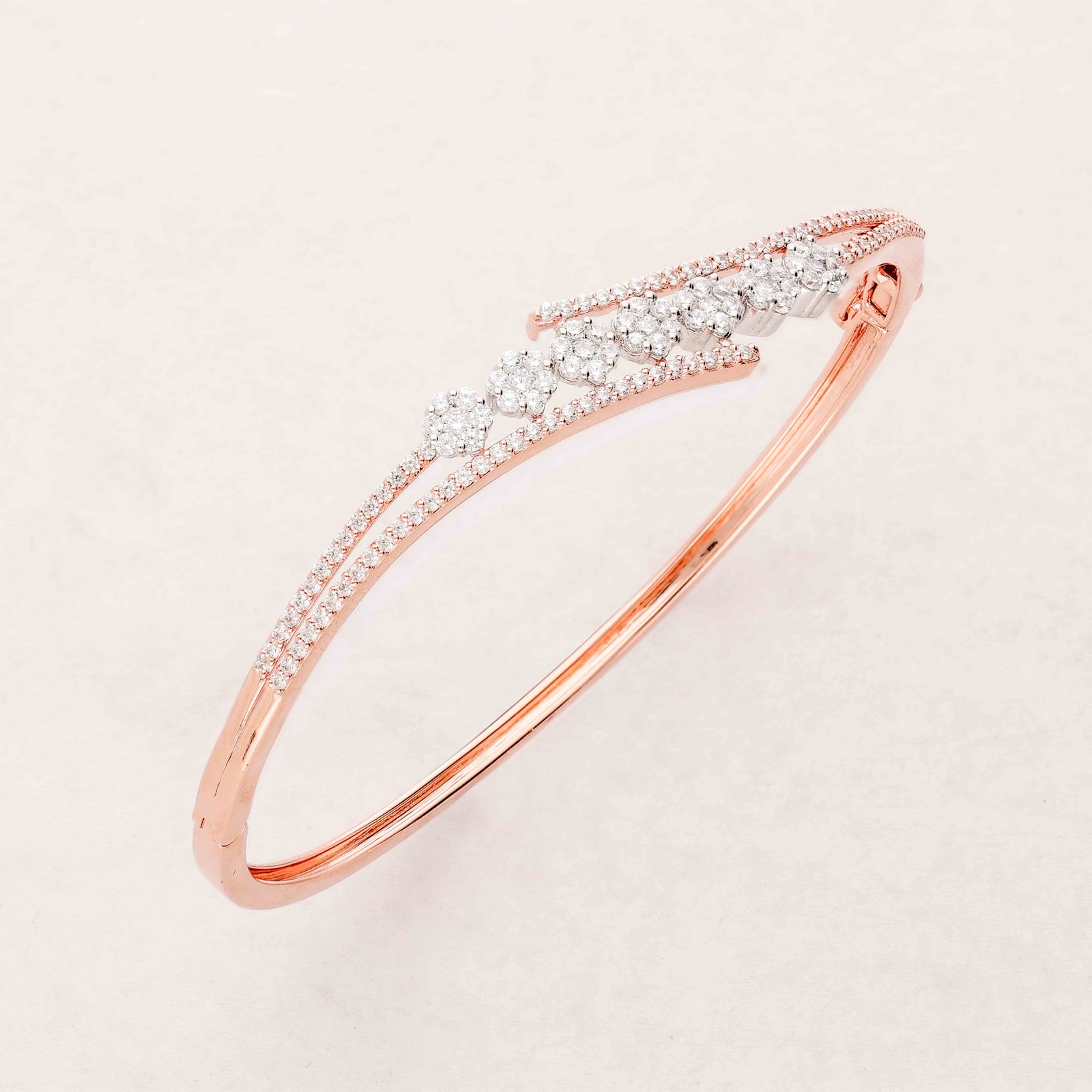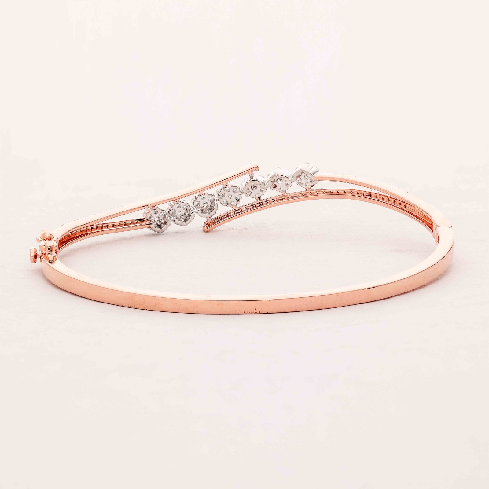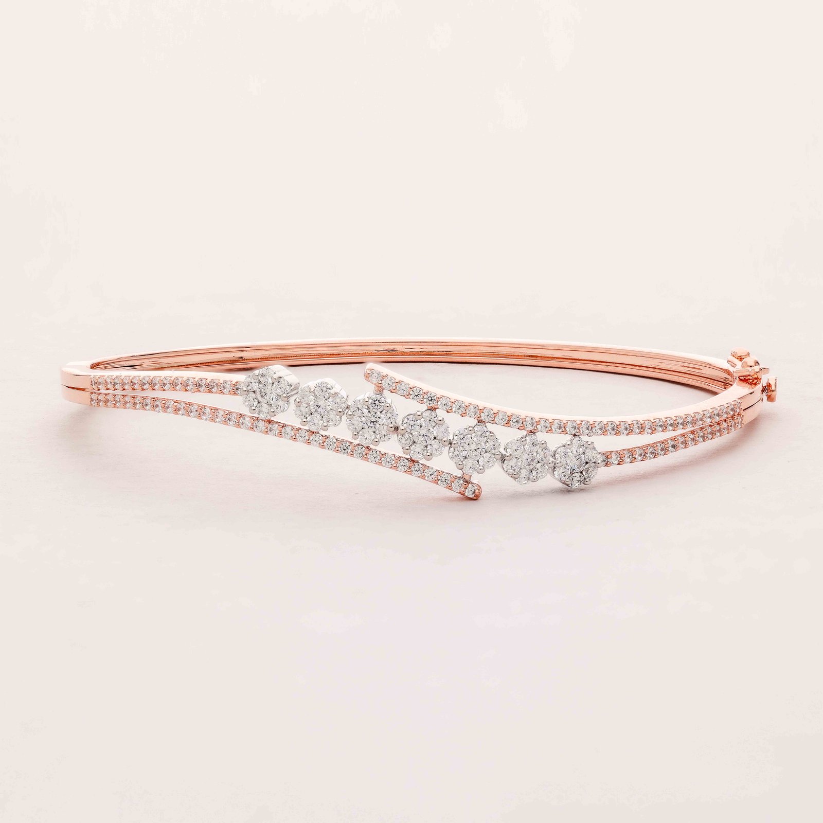 This exquisite bangle, crafted in lustrous rose gold, showcases a graceful curve adorned with a cluster of sparkling diamonds. The intricate design and radiant stones make it a timeless piece, perfect for adding a touch of elegance to any outfit.