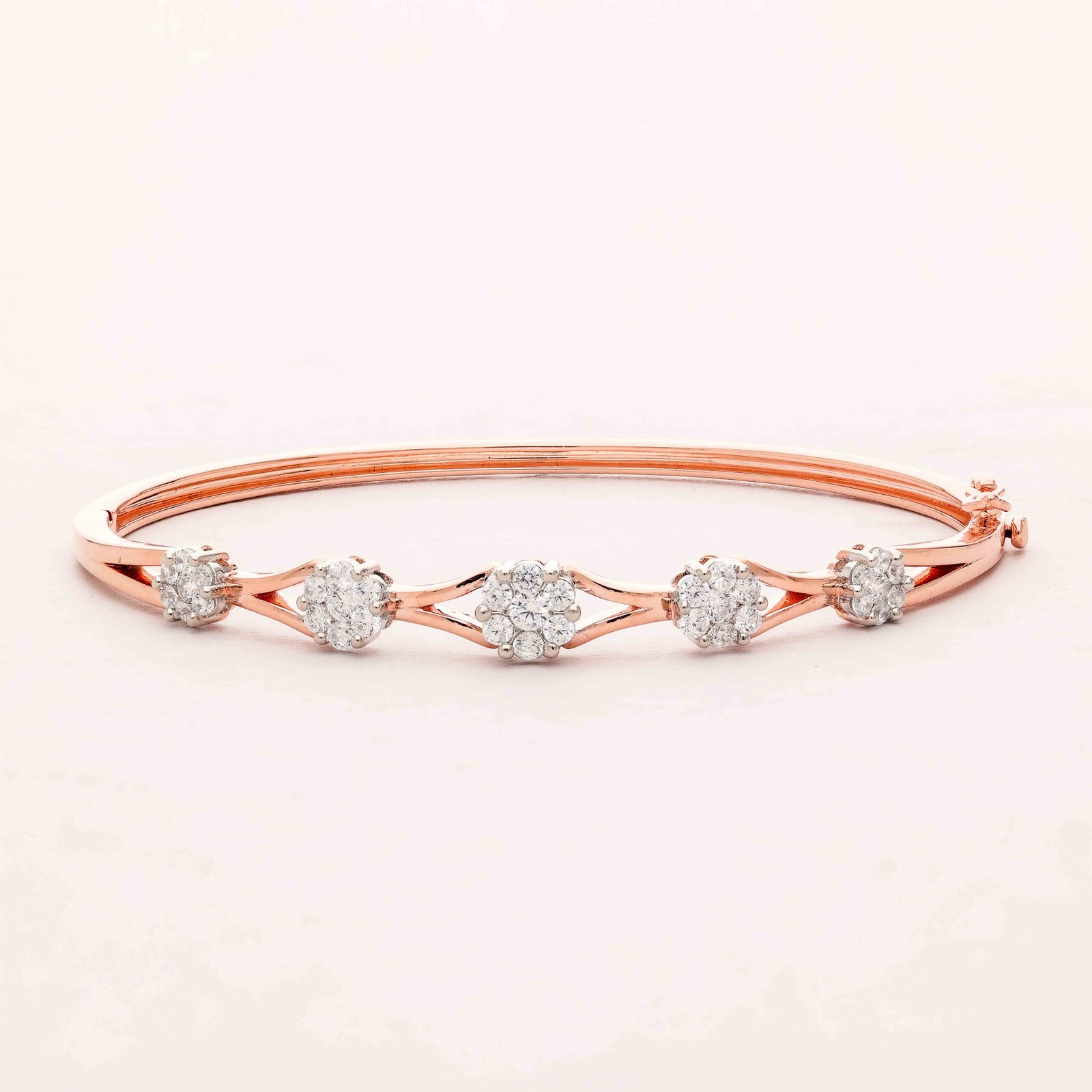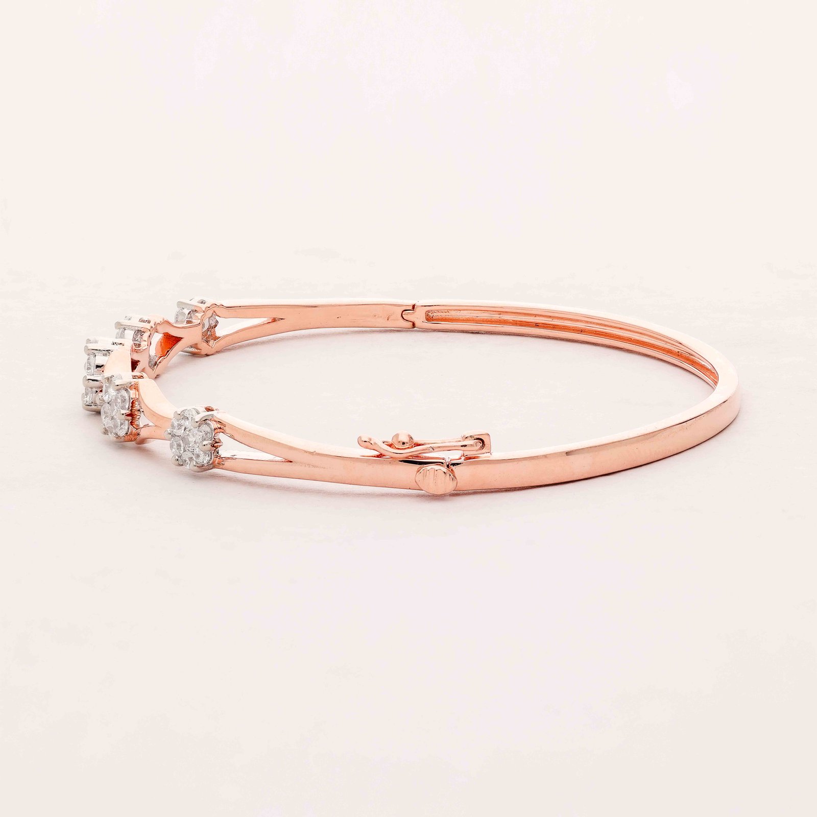 This exquisite bangle, crafted from a lustrous rose gold, features a series of sparkling diamond clusters intricately set to create a timeless piece of jewelry. The diamonds are meticulously arranged to catch and reflect light, offering a radiant sparkle with every movement. Its delicate design makes it a versatile accessory, perfect for both everyday elegance and special occasions.