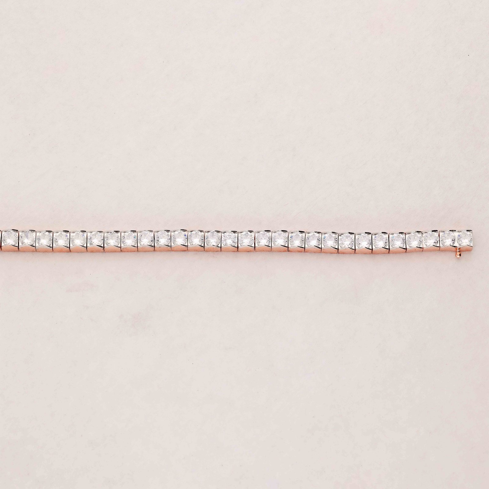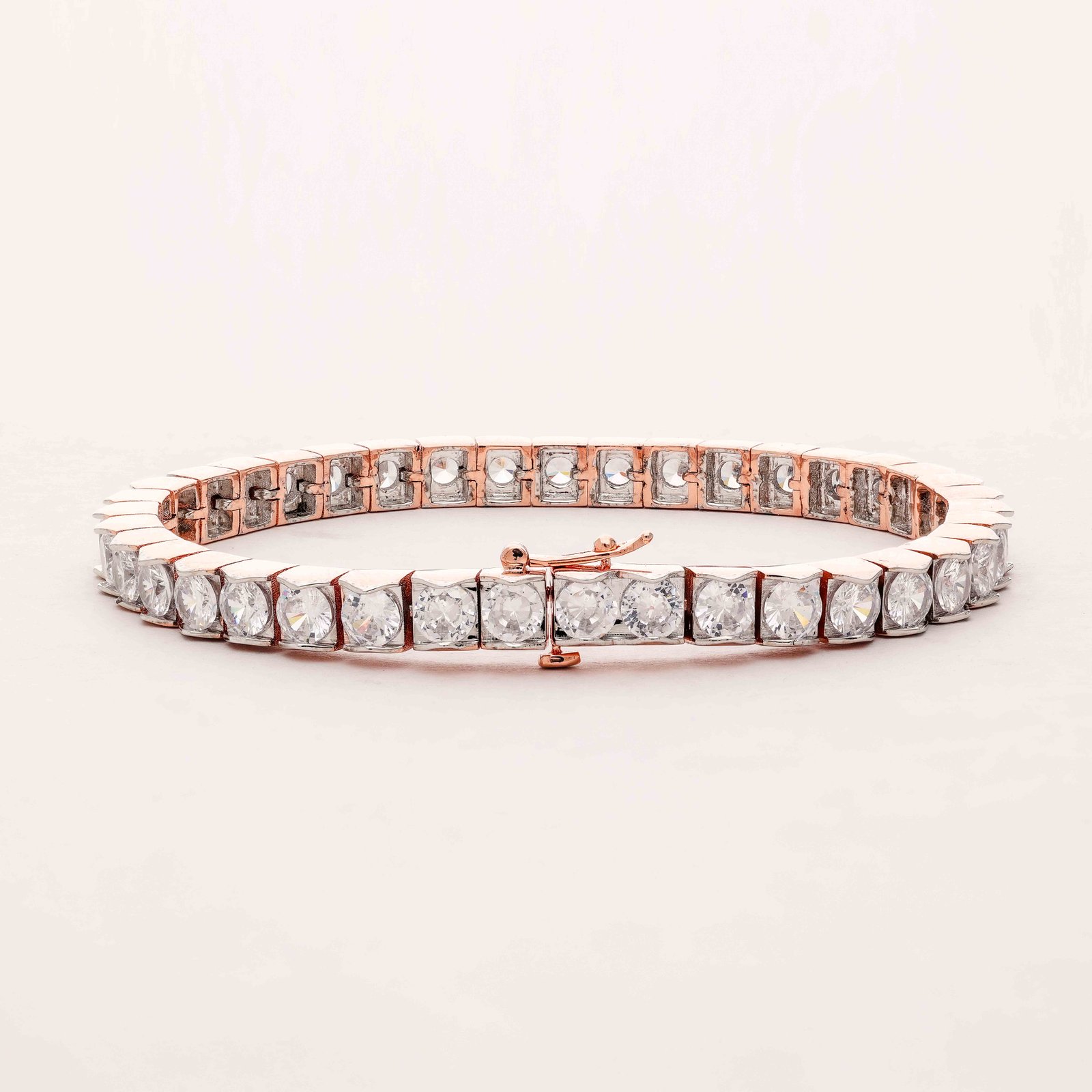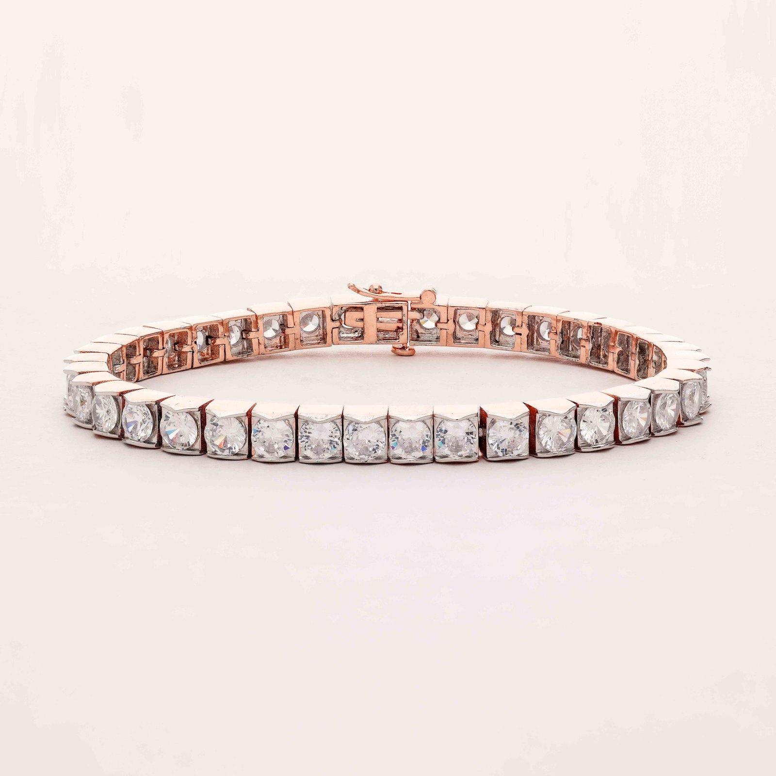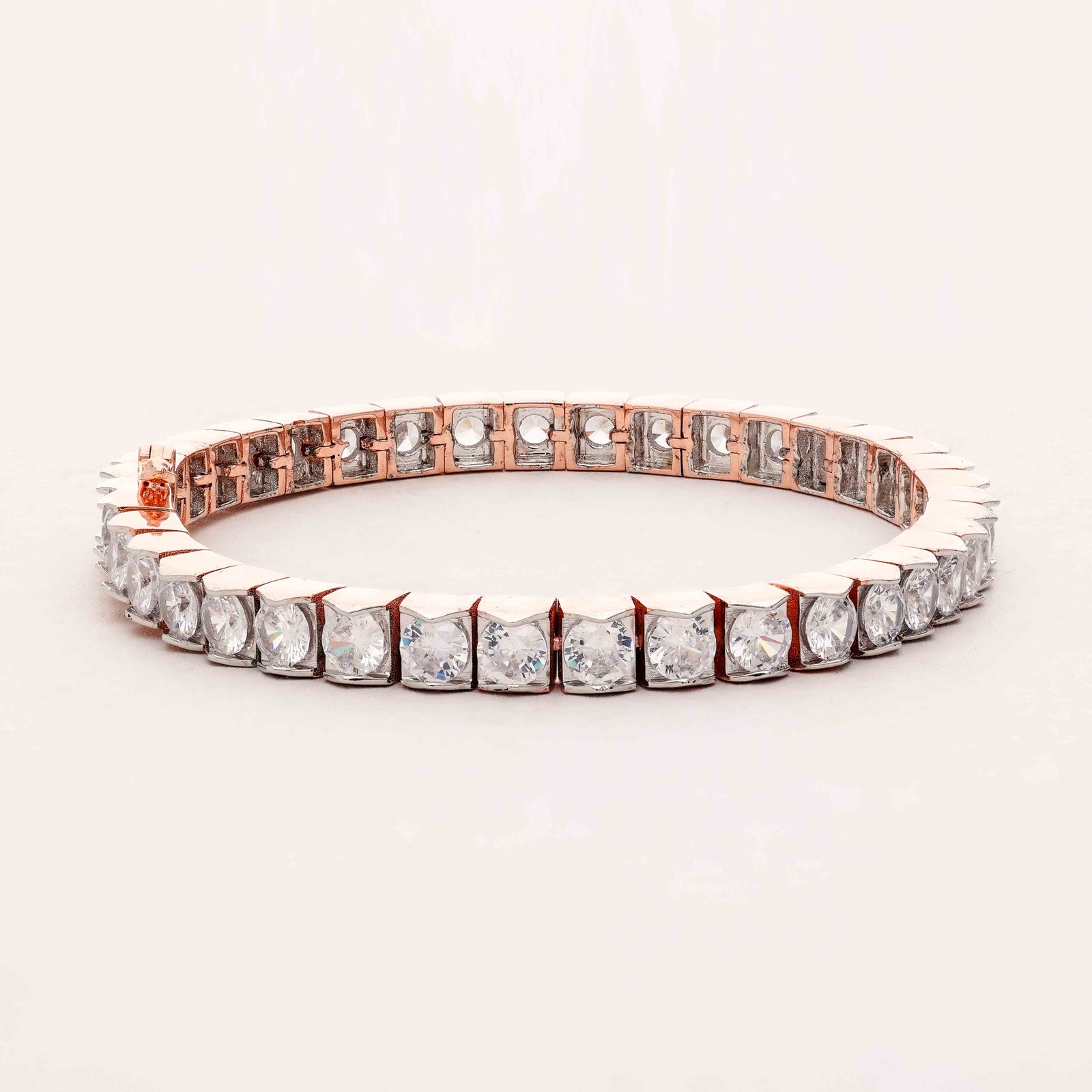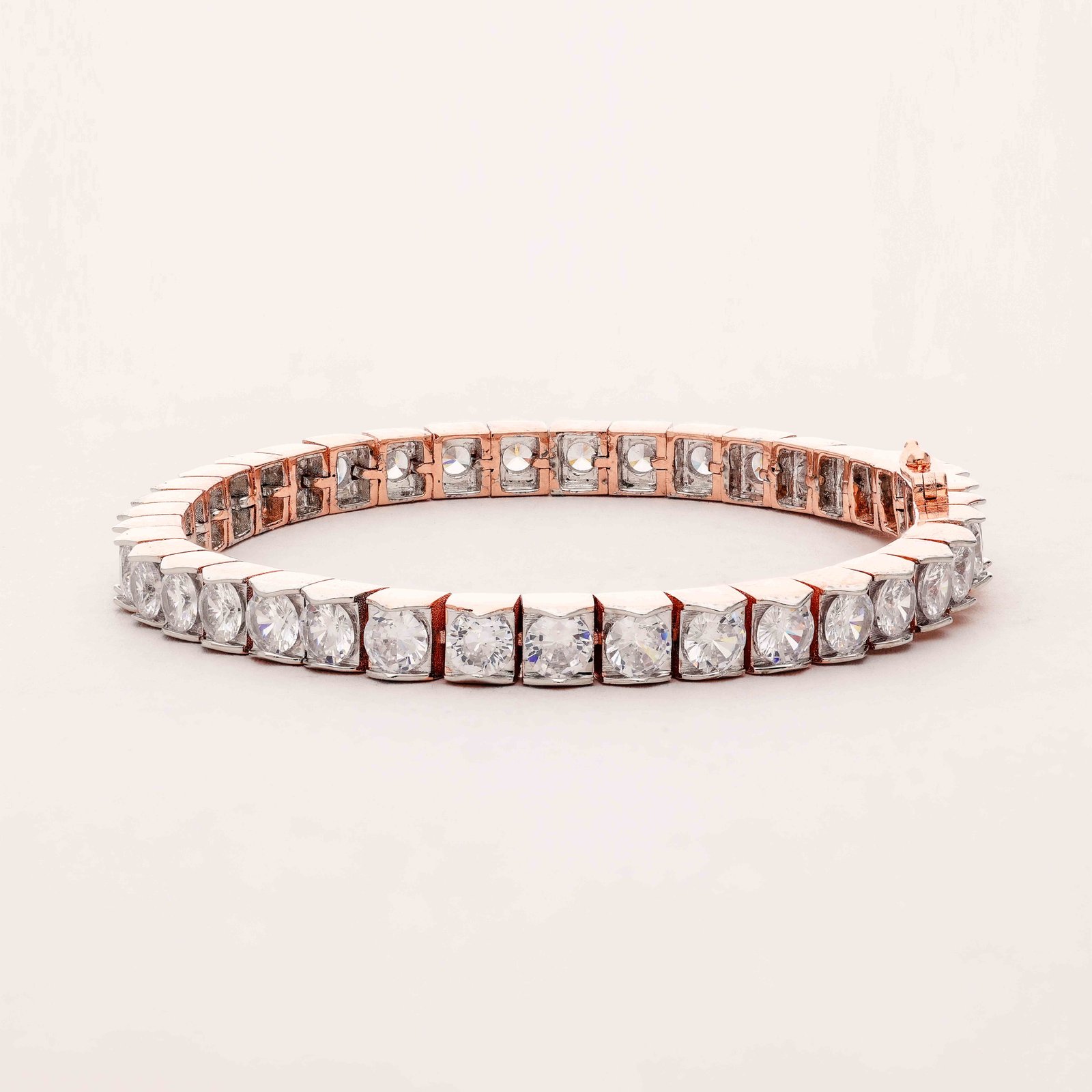 This exquisite bracelet features a row of sparkling crystals set in a durable, rose gold-toned setting. Each crystal is meticulously cut to catch and reflect light, offering a dazzling accessory perfect for both casual and formal attire.