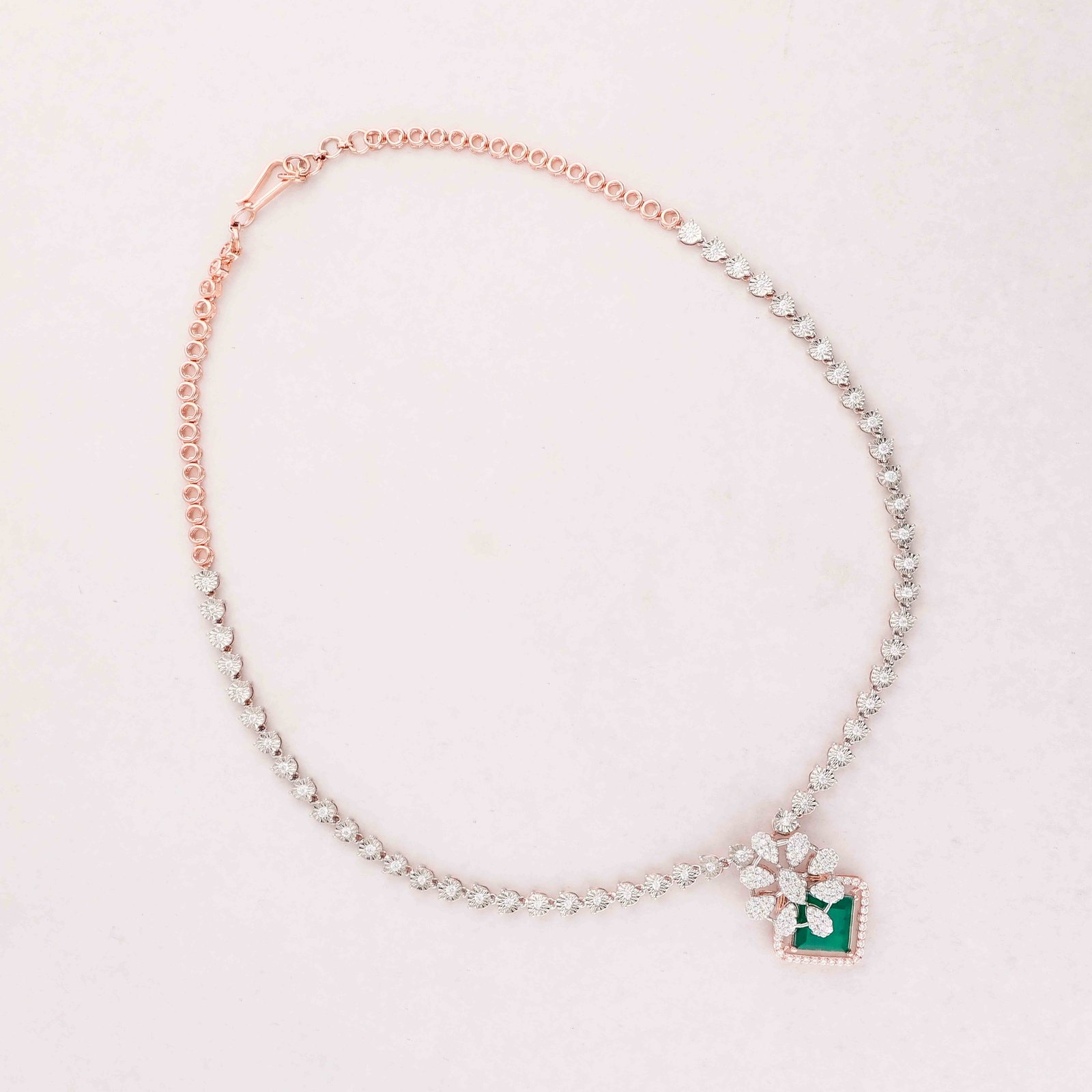 Unveil your sophisticated side with our “Emerald Elegance” jewelry set. This exquisite set features a stunning necklace adorned with sparkling diamonds, leading to a captivating emerald centerpiece, paired with matching earrings that exude elegance. The radiant green emerald is enveloped in a halo of dazzling diamonds, offering a blend of luxury and grace.